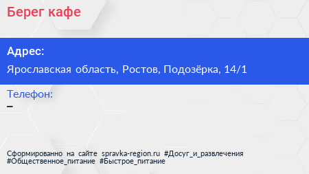 Берег, кафе по адресу Ярославская область, Ростов, Подозёрка, 14/1 в дальнейшем Организация, размещена в следующих категориях: