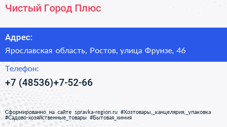 Чистый Город Плюс по адресу Ярославская область, Ростов, улица Фрунзе, 46 в дальнейшем Организация, размещена в следующих категориях: