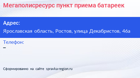 Мегаполисресурс, пункт приема батареек по адресу Ярославская область, Ростов, улица Декабристов, 46а в дальнейшем Организация, размещена в следующих категориях: