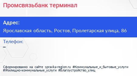 Промсвязьбанк, терминал по адресу Ярославская область, Ростов, Пролетарская улица, 86 в дальнейшем Организация, размещена в следующих категориях: