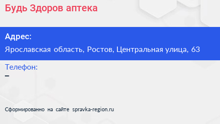 Будь Здоров!, аптека по адресу Ярославская область, Ростов, Центральная улица, 63 в дальнейшем Организация, размещена в следующих категориях: