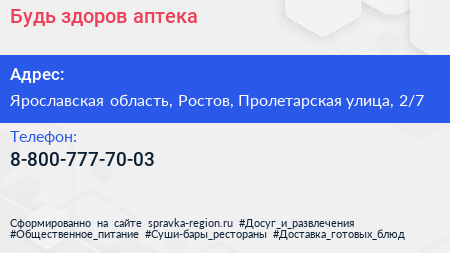 Будь здоров, аптека по адресу Ярославская область, Ростов, Пролетарская улица, 2/7 в дальнейшем Организация, размещена в следующих категориях: