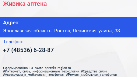 Живика, аптека по адресу Ярославская область, Ростов, Ленинская улица, 33 в дальнейшем Организация, размещена в следующих категориях: