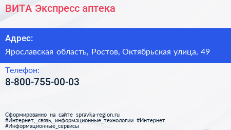 ВИТА Экспресс, аптека по адресу Ярославская область, Ростов, Октябрьская улица, 49 в дальнейшем Организация, размещена в следующих категориях: