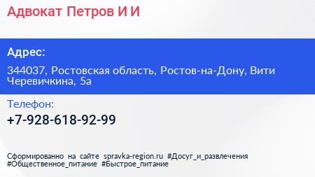 Адвокат Петров И.И. по адресу 344037, Ростовская область, Ростов-на-Дону, Вити Черевичкина, 5а в дальнейшем Организация, размещена в следующих категориях: