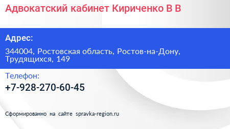 Адвокатский кабинет Кириченко В.В. по адресу 344004, Ростовская область, Ростов-на-Дону, Трудящихся, 149 в дальнейшем Организация, размещена в следующих категориях: