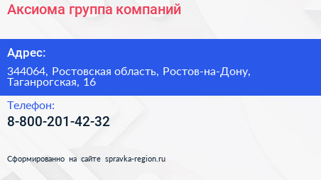 Аксиома, группа компаний по адресу 344064, Ростовская область, Ростов-на-Дону, Таганрогская, 16 в дальнейшем Организация, размещена в следующих категориях: