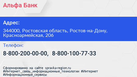 Альфа-Банк по адресу 344000, Ростовская область, Ростов-на-Дону, Красноармейская, 206 в дальнейшем Организация, размещена в следующих категориях: