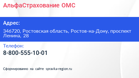 АльфаСтрахование-ОМС по адресу 346720, Ростовская область, Ростов-на-Дону, проспект Ленина, 28 в дальнейшем Организация, размещена в следующих категориях: