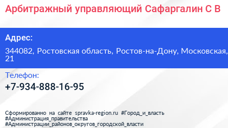 Арбитражный управляющий Сафаргалин С.В. по адресу 344082, Ростовская область, Ростов-на-Дону, Московская, 21 в дальнейшем Организация, размещена в следующих категориях: