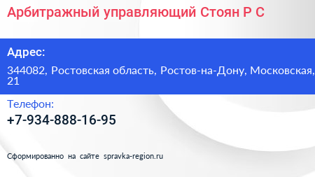Арбитражный управляющий Стоян Р.С. по адресу 344082, Ростовская область, Ростов-на-Дону, Московская, 21 в дальнейшем Организация, размещена в следующих категориях:
