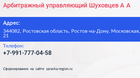Арбитражный управляющий Шуховцев А.А. по адресу 344082, Ростовская область, Ростов-на-Дону, Московская, 21 в дальнейшем Организация, размещена в следующих категориях: