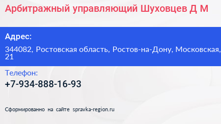 Арбитражный управляющий Шуховцев Д.М. по адресу 344082, Ростовская область, Ростов-на-Дону, Московская, 21 в дальнейшем Организация, размещена в следующих категориях: