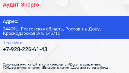 Аудит-Энерго по адресу 344091, Ростовская область, Ростов-на-Дону, Краснодарская 2-я, 145/11 в дальнейшем Организация, размещена в следующих категориях: