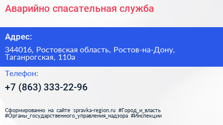 Аварийно-спасательная служба по адресу 344016, Ростовская область, Ростов-на-Дону, Таганрогская, 110а в дальнейшем Организация, размещена в следующих категориях: