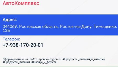 АвтоКомплекс по адресу 344069, Ростовская область, Ростов-на-Дону, Тимошенко, 13Б в дальнейшем Организация, размещена в следующих категориях: