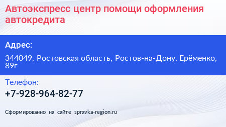 Автоэкспресс, центр помощи оформления автокредита по адресу 344049, Ростовская область, Ростов-на-Дону, Ерёменко, 89г в дальнейшем Организация, размещена в следующих категориях:
