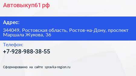 Автовыкуп61.рф по адресу 344049, Ростовская область, Ростов-на-Дону, проспект Маршала Жукова, 36 в дальнейшем Организация, размещена в следующих категориях: