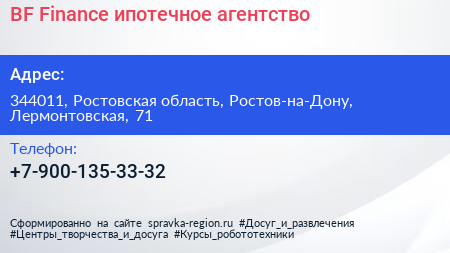 BF Finance, ипотечное агентство по адресу 344011, Ростовская область, Ростов-на-Дону, Лермонтовская, 71 в дальнейшем Организация, размещена в следующих категориях: