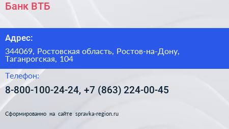 Банк ВТБ по адресу 344069, Ростовская область, Ростов-на-Дону, Таганрогская, 104 в дальнейшем Организация, размещена в следующих категориях: