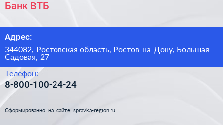 Банк ВТБ по адресу 344082, Ростовская область, Ростов-на-Дону, Большая Садовая, 27 в дальнейшем Организация, размещена в следующих категориях:
