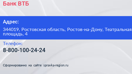 Банк ВТБ по адресу 344019, Ростовская область, Ростов-на-Дону, Театральная площадь, 4 в дальнейшем Организация, размещена в следующих категориях: