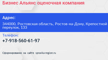 Бизнес Альянс, оценочная компания по адресу 344000, Ростовская область, Ростов-на-Дону, Крепостной переулок, 133 в дальнейшем Организация, размещена в следующих категориях: