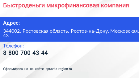 Быстроденьги, микрофинансовая компания по адресу 344002, Ростовская область, Ростов-на-Дону, Московская, 43 в дальнейшем Организация, размещена в следующих категориях: