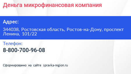 Деньга, микрофинансовая компания по адресу 344038, Ростовская область, Ростов-на-Дону, проспект Ленина, 101/22 в дальнейшем Организация, размещена в следующих категориях: