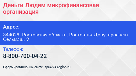 Деньги Людям, микрофинансовая организация по адресу 344029, Ростовская область, Ростов-на-Дону, проспект Сельмаш, 9 в дальнейшем Организация, размещена в следующих категориях: