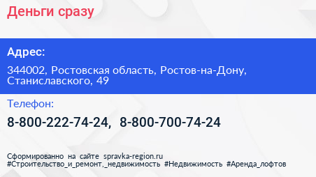 Деньги сразу по адресу 344002, Ростовская область, Ростов-на-Дону, Станиславского, 49 в дальнейшем Организация, размещена в следующих категориях:
