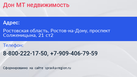 Дон-МТ-недвижимость по адресу Ростовская область, Ростов-на-Дону, проспект Солженицына, 21 ст2 в дальнейшем Организация, размещена в следующих категориях: