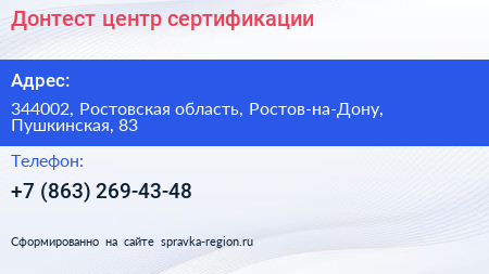 Донтест, центр сертификации по адресу 344002, Ростовская область, Ростов-на-Дону, Пушкинская, 83 в дальнейшем Организация, размещена в следующих категориях: