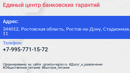 Единый центр банковских гарантий по адресу 344012, Ростовская область, Ростов-на-Дону, Стадионная, 11 в дальнейшем Организация, размещена в следующих категориях: