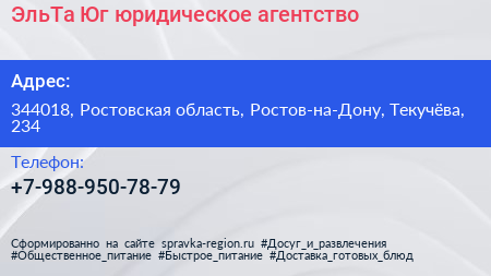 ЭльТа-Юг, юридическое агентство по адресу 344018, Ростовская область, Ростов-на-Дону, Текучёва, 234 в дальнейшем Организация, размещена в следующих категориях: