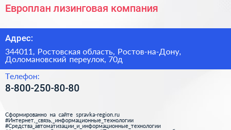 Европлан, лизинговая компания по адресу 344011, Ростовская область, Ростов-на-Дону, Доломановский переулок, 70д в дальнейшем Организация, размещена в следующих категориях: