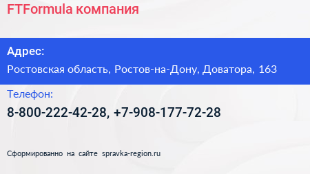 FTFormula, компания по адресу Ростовская область, Ростов-на-Дону, Доватора, 163 в дальнейшем Организация, размещена в следующих категориях: