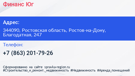 Финанс Юг по адресу 344090, Ростовская область, Ростов-на-Дону, Благодатная, 247 в дальнейшем Организация, размещена в следующих категориях: