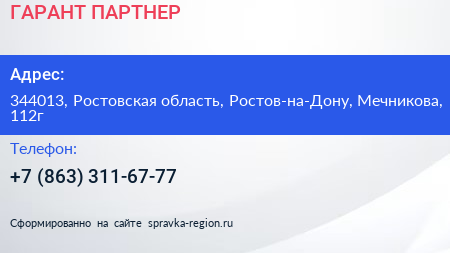 ГАРАНТ ПАРТНЕР по адресу 344013, Ростовская область, Ростов-на-Дону, Мечникова, 112г в дальнейшем Организация, размещена в следующих категориях: