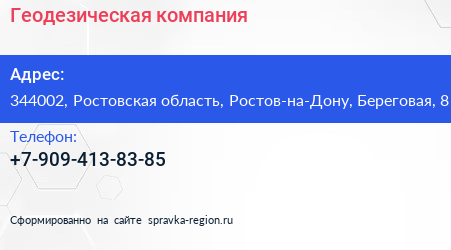 Геодезическая компания по адресу 344002, Ростовская область, Ростов-на-Дону, Береговая, 8 в дальнейшем Организация, размещена в следующих категориях: