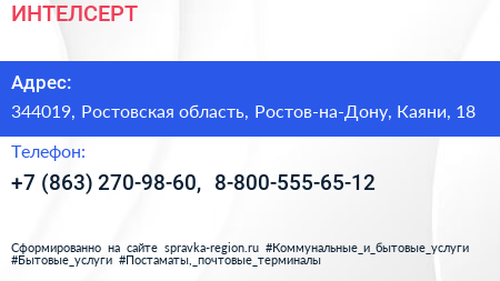ИНТЕЛСЕРТ по адресу 344019, Ростовская область, Ростов-на-Дону, Каяни, 18 в дальнейшем Организация, размещена в следующих категориях: