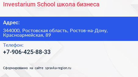 Investarium School, школа бизнеса по адресу 344000, Ростовская область, Ростов-на-Дону, Красноармейская, 89 в дальнейшем Организация, размещена в следующих категориях: