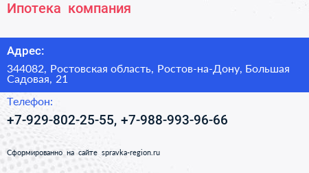 Ипотека+, компания по адресу 344082, Ростовская область, Ростов-на-Дону, Большая Садовая, 21 в дальнейшем Организация, размещена в следующих категориях: