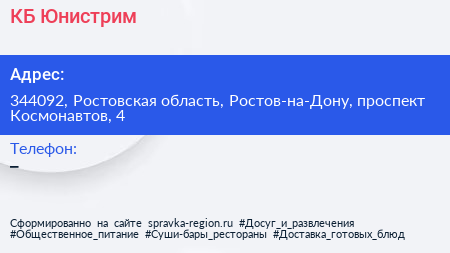 КБ Юнистрим по адресу 344092, Ростовская область, Ростов-на-Дону, проспект Космонавтов, 4 в дальнейшем Организация, размещена в следующих категориях: