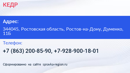 КЕДР по адресу 344045, Ростовская область, Ростов-на-Дону, Думенко, 11Б в дальнейшем Организация, размещена в следующих категориях: