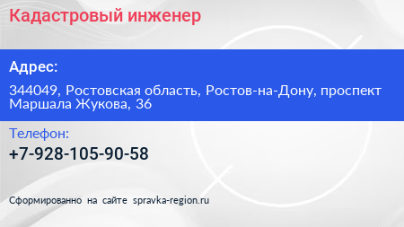 Кадастровый инженер по адресу 344049, Ростовская область, Ростов-на-Дону, проспект Маршала Жукова, 36 в дальнейшем Организация, размещена в следующих категориях: