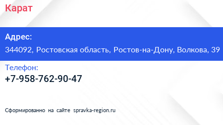 Карат по адресу 344092, Ростовская область, Ростов-на-Дону, Волкова, 39 в дальнейшем Организация, размещена в следующих категориях: