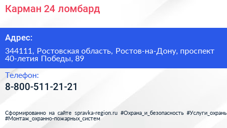 Карман 24, ломбард по адресу 344111, Ростовская область, Ростов-на-Дону, проспект 40-летия Победы, 89 в дальнейшем Организация, размещена в следующих категориях: