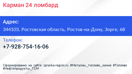 Карман 24, ломбард по адресу 344103, Ростовская область, Ростов-на-Дону, Зорге, 68 в дальнейшем Организация, размещена в следующих категориях:
