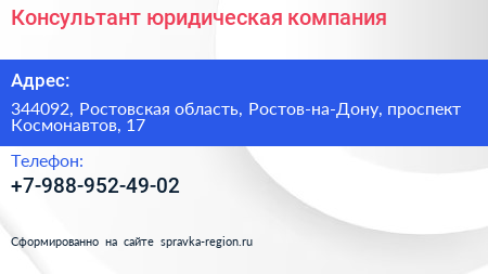 Консультант, юридическая компания по адресу 344092, Ростовская область, Ростов-на-Дону, проспект Космонавтов, 17 в дальнейшем Организация, размещена в следующих категориях: